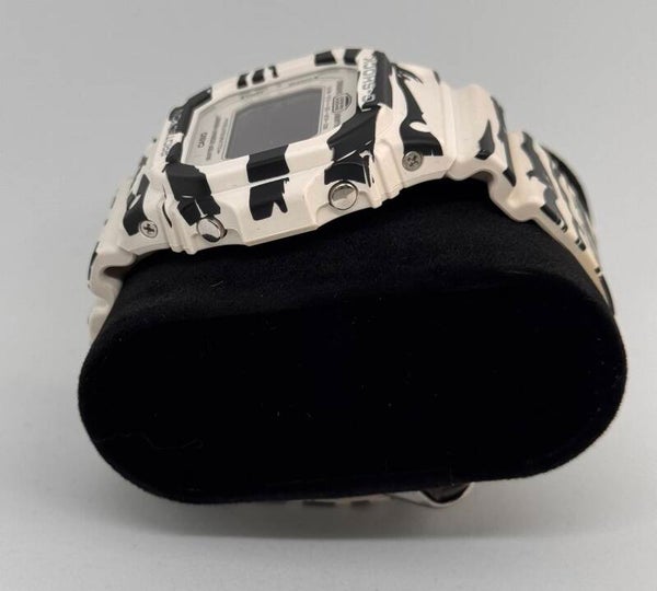 The Casio G-Shock DW-D5600BW-7, nicknamed “Zebra”, was released in October 2015 as part of the White and Black collection. It reimagines the classic square case with a striking monochrome pattern across the band and bezel, inspired by zebra stripes. This model has become a collector favourite for its bold contrast design and limited production run, making it increasingly difficult to find in good condition.